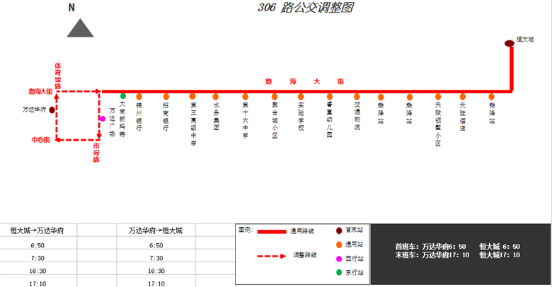 調(diào)整后:“恒大城”—渤海大街—原線—“錦州銀行”—市府路—“萬達(dá)廣場”(西行單向站)—中心街—“萬達(dá)華府”。